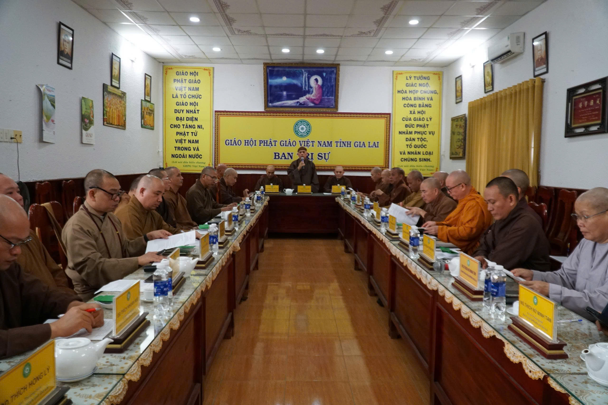 Cuộc họp dưới sự chủ tọa của TT. Thích Tâm Mãn, Ủy viên Hội đồng Trị sự, Trưởng Ban Trị sự GHPGVN tỉnh Gia Lai; TT. Thích Đồng Thành, Ủy viên Hội đồng Trị sự, Phó ban Thường trực Ban Trị sự GHPGVN tỉnh Gia Lai; TT. Thích Nhuận Trí, Phó Trưởng Ban kiêm Chánh Thư ký Ban Trị sự Phật giáo tỉnh. Tham dự có chư Tôn đức Phó Ban Trị sự tỉnh, chư Tôn đức Tăng Ni, Cư sĩ Phật tử thành viên Ban Thường trực Ban Trị sự GHPGVN tỉnh Gia Lai.