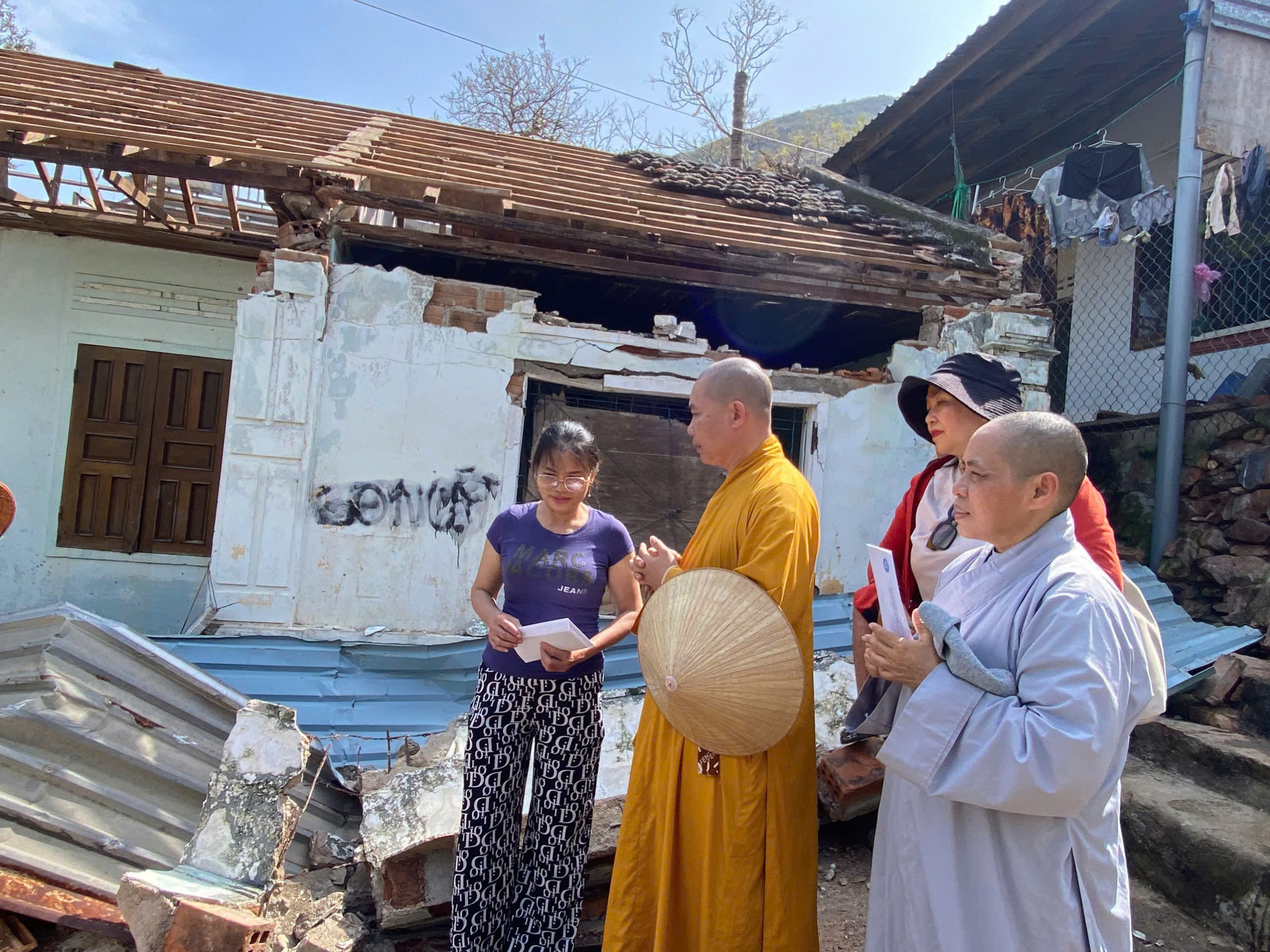 Sau buổi phát quà, nhờ sự hỗ trợ của TT.Thích Quảng Giác, UVTT Ban Trị sự tỉnh, Trụ trì chùa Hải Long, Hải Minh đưa đoàn đến các ngôi nhà bị sập và bị tốc mái. Tại mỗi nhà, Thượng tọa Trưởng đoàn đã có lời động viên nhằm xoa dịu những đau thương mất mát và tặng mỗi gia đình 2 triệu để góp phần sửa chữa lại nhà ổn định cuộc sống.