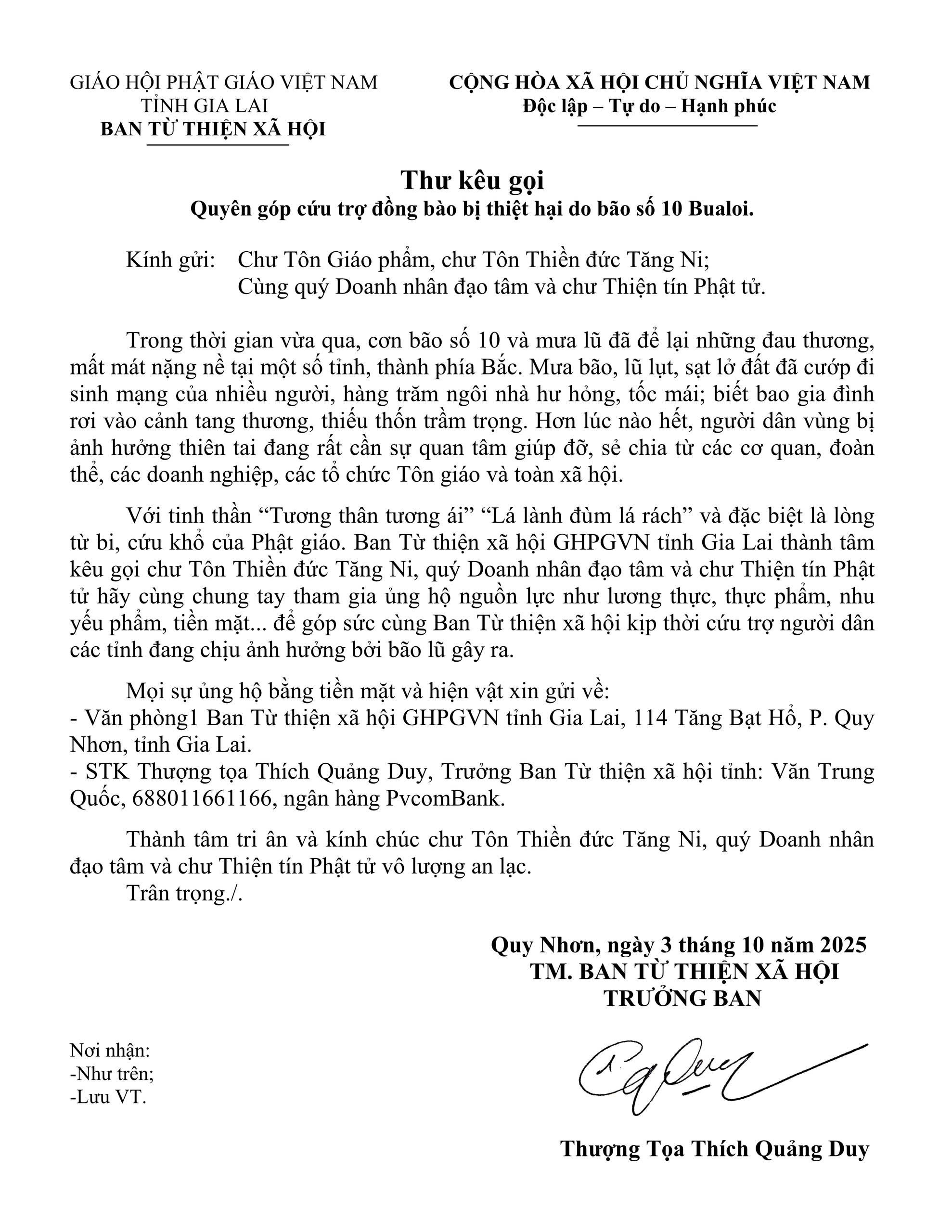 Ban Từ thiện xã hội GHPGVN tỉnh Gia Lai ra Thư kêu gọi quyên góp cứu trợ đồng bào bị thiệt hại do bão số 10 Bualoi