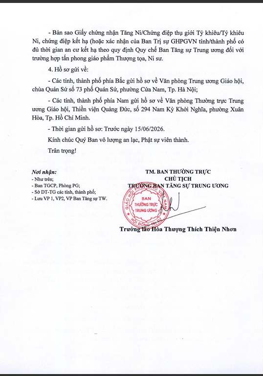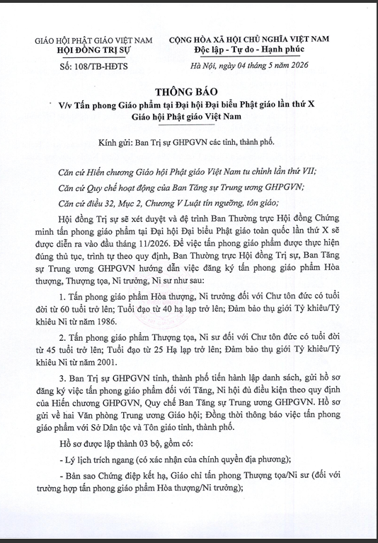 Trung ương Giáo hội ra Thông báo số 108/TB-HĐTS về việc tấn phong Giáo phẩm tại Đại hội đại biểu Phật giáo toàn quốc lần thứ X, diễn ra vào đầu tháng 11-2026.