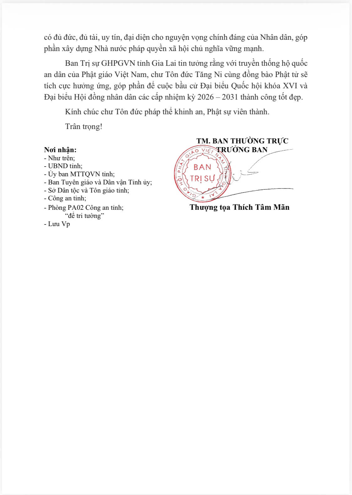 Hôm nay ngày 10 tháng 3 năm 2026, Thượng tọa Thích Tâm Mãn, Trưởng ban Ban Trị sự GHPGVN tỉnh Gia Lai ký công văn số 183/CV-BTS đề nghị Tăng Ni, Phật tử tỉnh Gia Lai tích cực tham gia hưởng ứng bầu cử đại biểu Quốc hội khóa XVI và HĐND các cấp nhiệm kỳ 2026-2031.