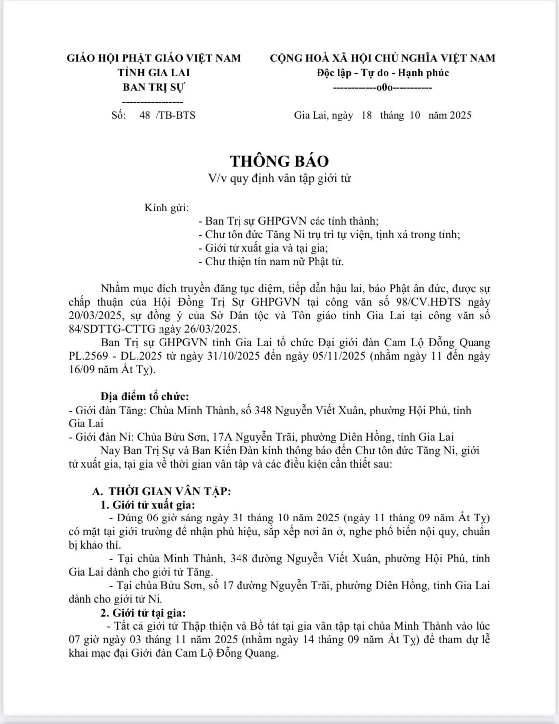 Ban Trị sự và Ban Kiến Đàn Đại giới đàn Cam Lộ Đỗng Quang ban hành Thông báo số 48 ngày 18 tháng 10 năm 2025 về việc quy định vân tập giới tử.