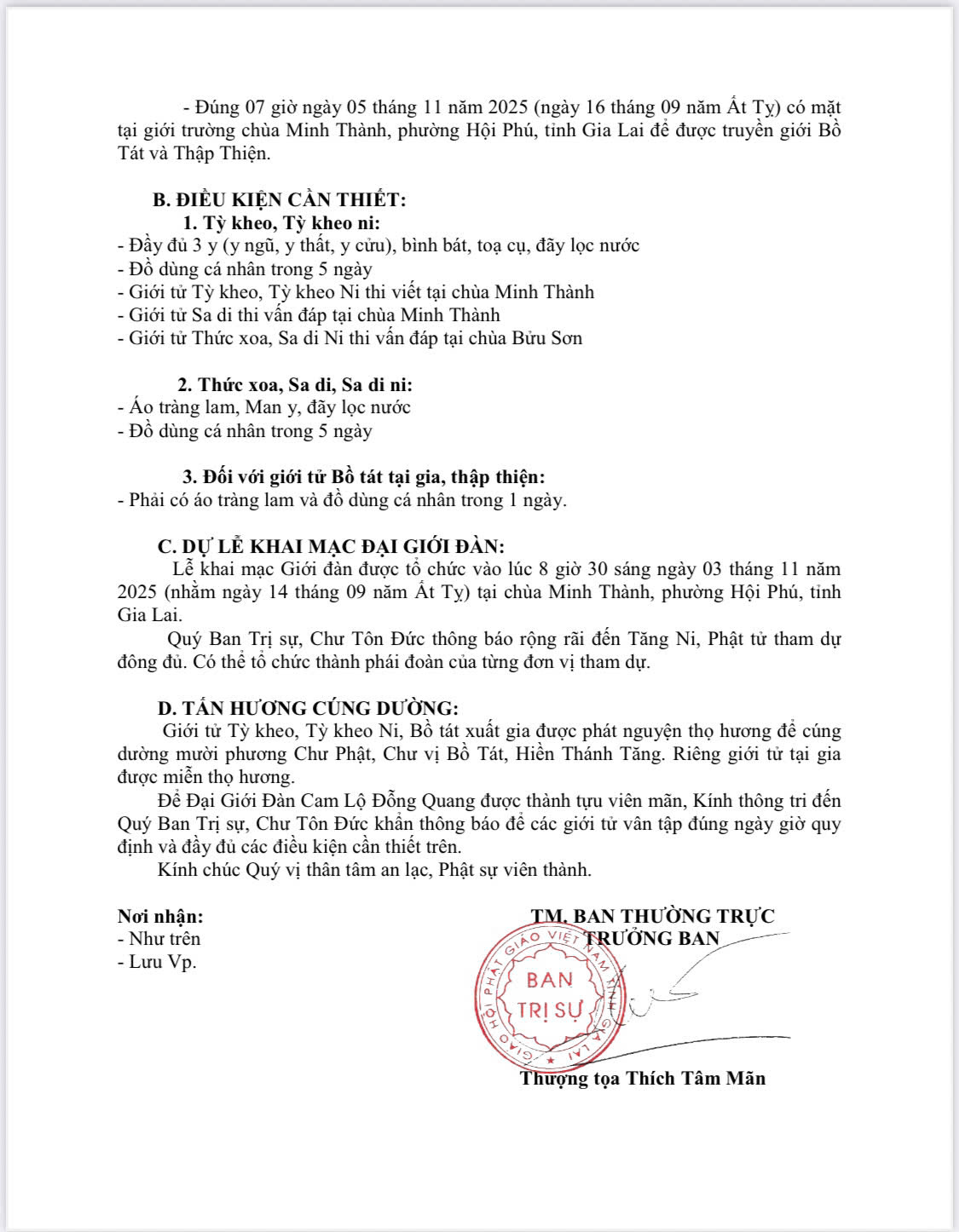 Theo Thông báo, giới tử xuất gia vân tập về Giới đàn Tăng tại chùa Minh Thành, 348 đường Nguyễn Viết Xuân, phường Hội Phú, tỉnh Gia Lai và Giới đàn Ni tại chùa Bửu Sơn, số 17 đường Nguyễn Trãi, phường Diên Hồng, tỉnh Gia Lai vào lúc 6 giờ 00 ngày ngày 31 tháng 10 năm 2025 (ngày 11 tháng 09 năm Ất Tỵ).