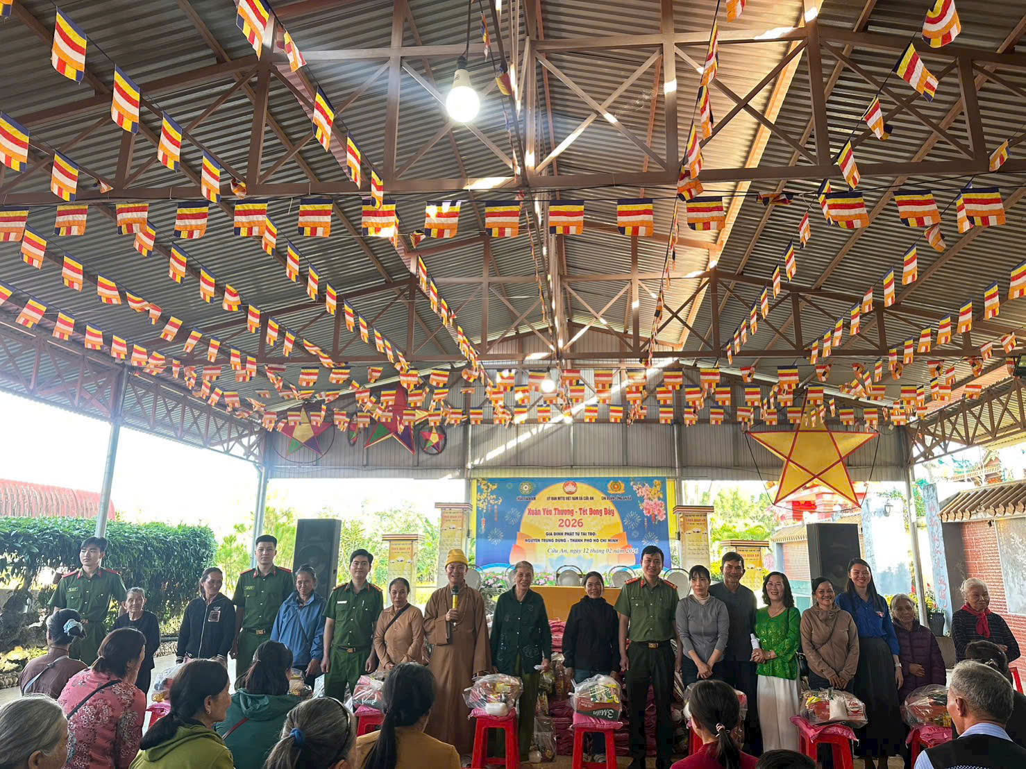 Chiều ngày 12/02/2026 (nhằm ngày 25/Chạp năm Ất Tỵ) trong không khí rộn ràng chuẩn bị đón Xuân mới, ĐĐ. Thích Quang Dũng, trụ trì chùa Quan Âm (xã Cửu An, tỉnh Gia Lai) đã phối hợp cùng Ủy ban Mặt trận Tổ quốc Việt Nam xã Cửu An, Chi đoàn Công an xã và gia đình Phật tử Nguyễn Trung Dũng – nhà tài trợ chính, tổ chức chương trình “Tết nhân ái” trao tặng gần 200 phần quà Tết đến bà con tại địa phương.