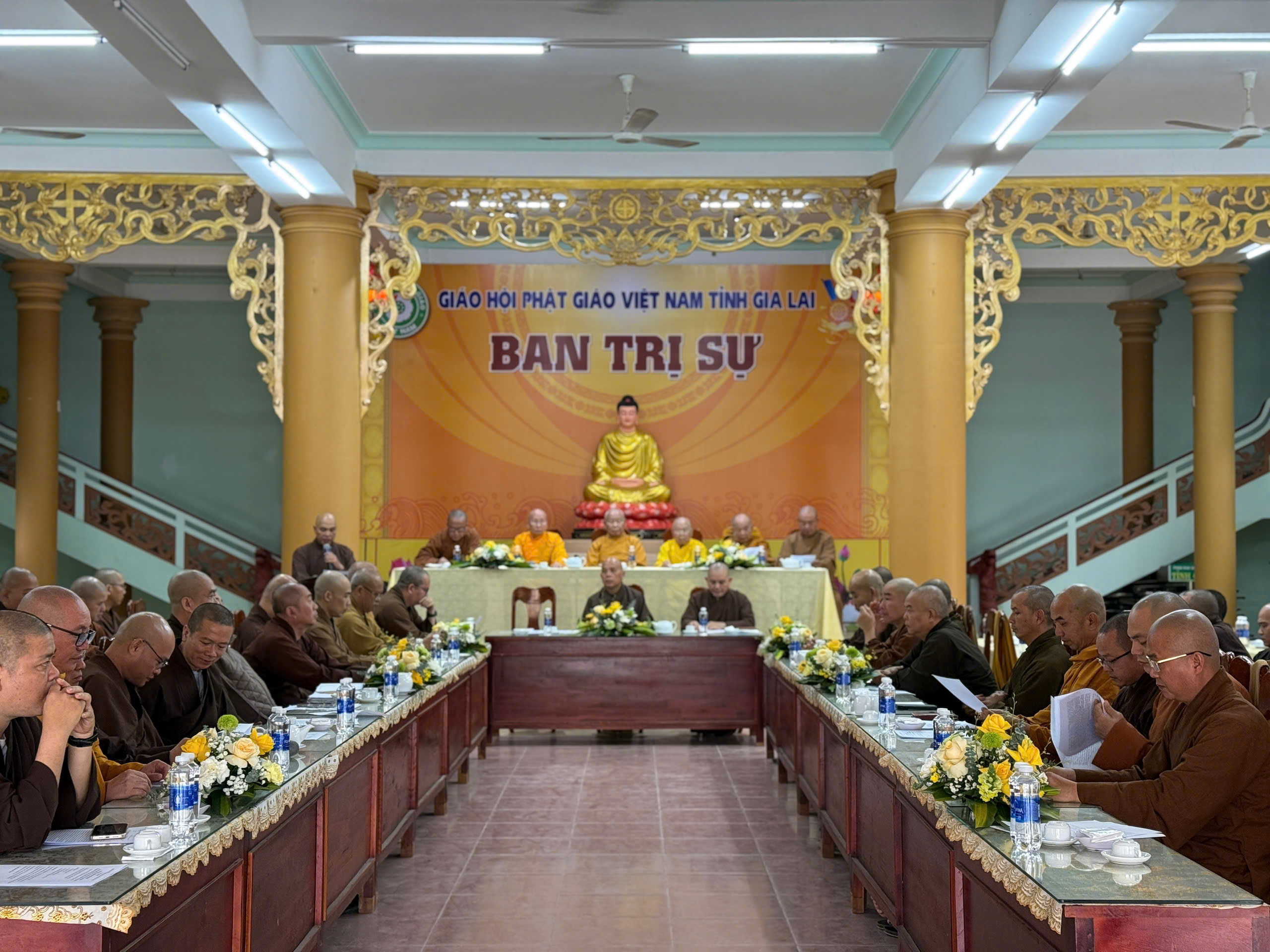 Hội nghị dưới sự chủ tọa của TT. Thích Tâm Mãn, Ủy viên Hội đồng Trị sự, Trưởng Ban Trị sự GHPGVN tỉnh Gia Lai; TT. Thích Đồng Thành, Ủy viên Hội đồng Trị sự, Phó ban Thường trực Ban Trị sự GHPGVN tỉnh Gia Lai; TT. Thích Nhuận Trí, Phó Trưởng Ban kiêm Chánh Thư ký Ban Trị sự GHPGVN tỉnh Gia Lai.
