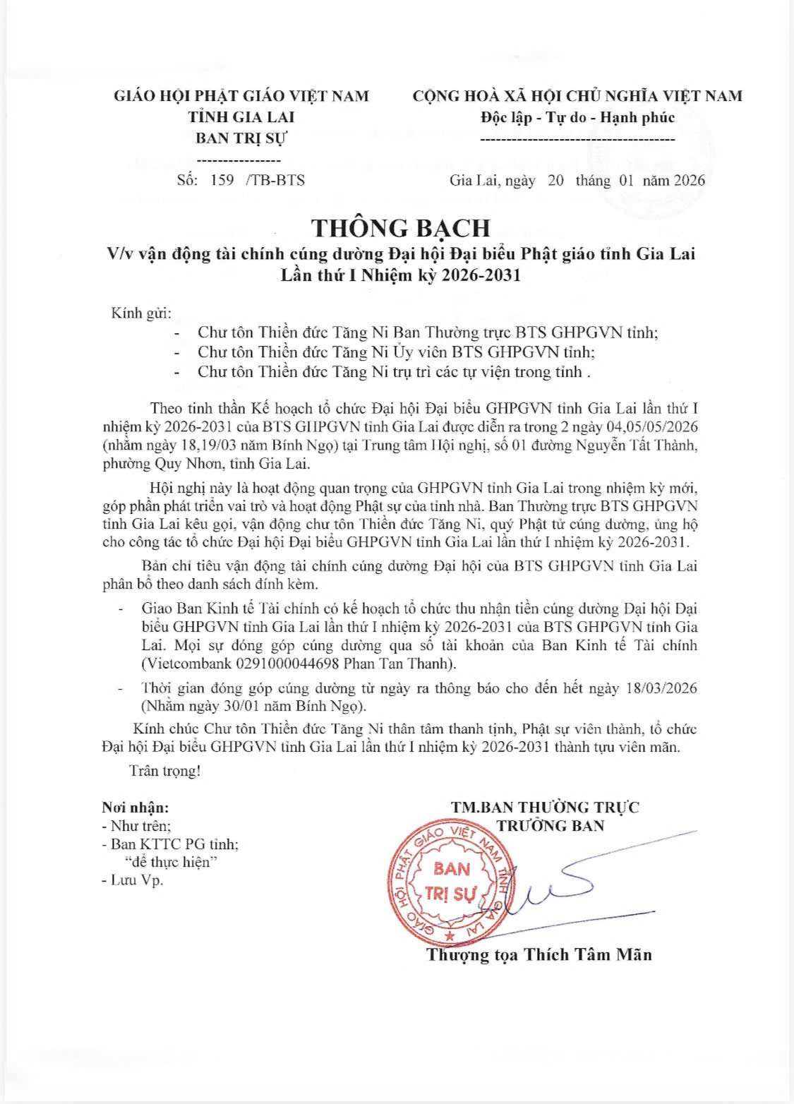 Thượng tọa Thích Tâm Mãn, Trưởng ban Ban Trị sự GHPGVN tỉnh Gia Lai ngày 20/1/2026 đã ký Thông bạch vận động tài chánh cúng dường Đại hội Đại biểu Phật giáo tỉnh Gia Lai lần thứ I, nhiệm kỳ 2026-2031, gửi đến chư Tôn đức Tăng Ni trong Ban Thường trực Ban Trị sự GHPGVN tỉnh, chư Tôn đức Tăng Ni trong Ban Trị sự GHPGVN tỉnh và chư Tôn đức Tăng Ni trụ trì các tự viện trong tỉnh.