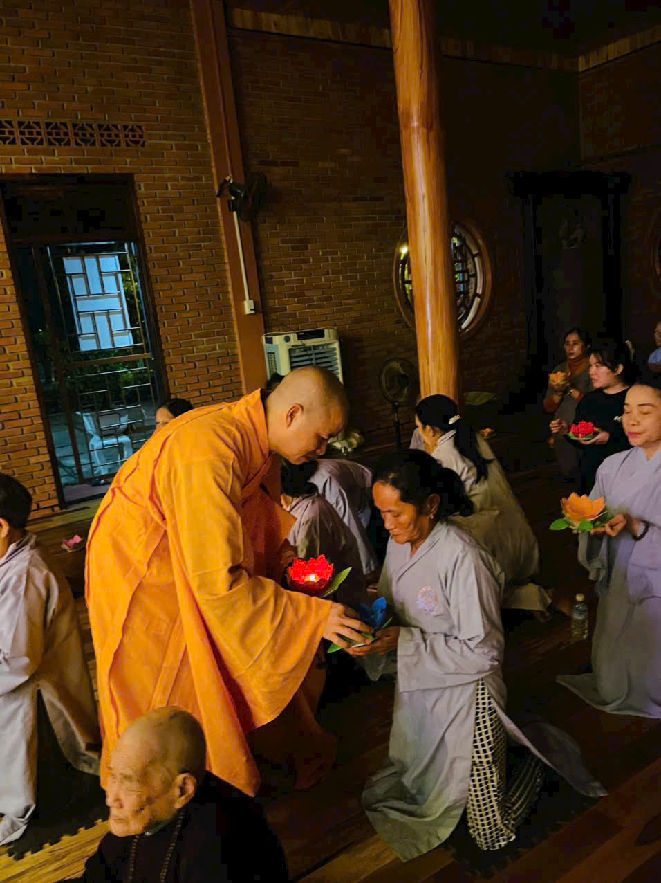 Trong khoảnh khắc thiêng liêng ấy, tiếng niệm hồng danh Nam Mô A Di Đà Phật vang lên trầm hùng, quyện cùng hương sen thanh khiết và ánh sáng hoa đăng, tạo nên một bản từ bi ca lặng thầm nhưng đầy năng lượng gia trì, nhiếp tâm đại chúng quay về nương tựa Tam Bảo, vun bồi tín tâm và nguyện lực vãng sanh Tịnh độ.
